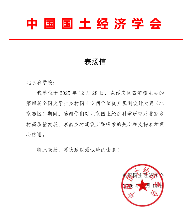 近日,中国国土经济学会致信北京农学院,对我校生资学院承办第四届全国大学生乡村国土空间价值提升规划设计大赛北京赛区启动及调研会的工作予以通报表扬。