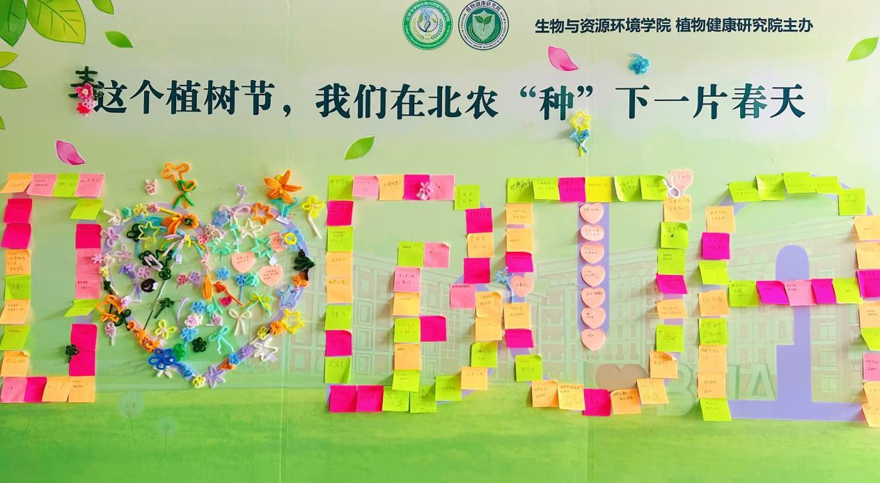 创意实践暖人心,春日美好定格在北农。“指尖生花,定格春日”环节温情满满,现场设置的花朵扭扭棒制作区,成为同学们发挥创意的天地。大家亲手制作出形态各异的创意花朵,在体验手工乐趣的同时,纷纷在便利贴上写下对学校的美好祝福、对绿色未来的无限憧憬。一张张写满心意的便利贴汇聚一堂,拼出醒目的“I love BUA”图案,将北农学子对校园的热爱、对生态美好未来的期盼,定格在这个充满生机的春日里。