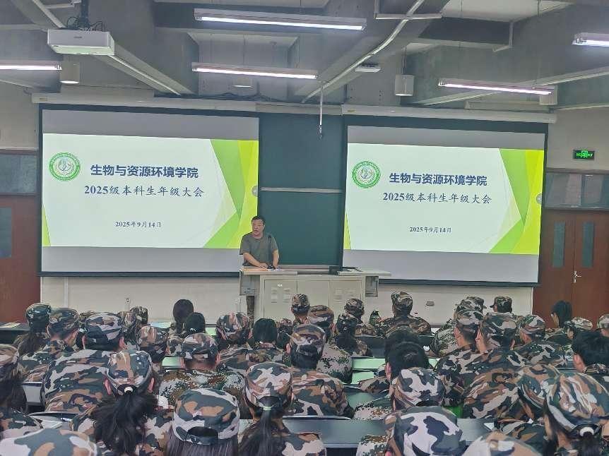 为帮助2025级本科新生快速适应大学生活,明确纪律要求,树立规则意识,筑牢思想安全防线,生物与资源环境学院于2025年9月14日下午,在教B103组织召开2025级本科生年级大会。学院党委副书记、副院长王磊,新生班主任刘灿、刘冰颖,全体新生班主任助理,2025级本科生参加会议,会议由新生辅导员谷薇主持。