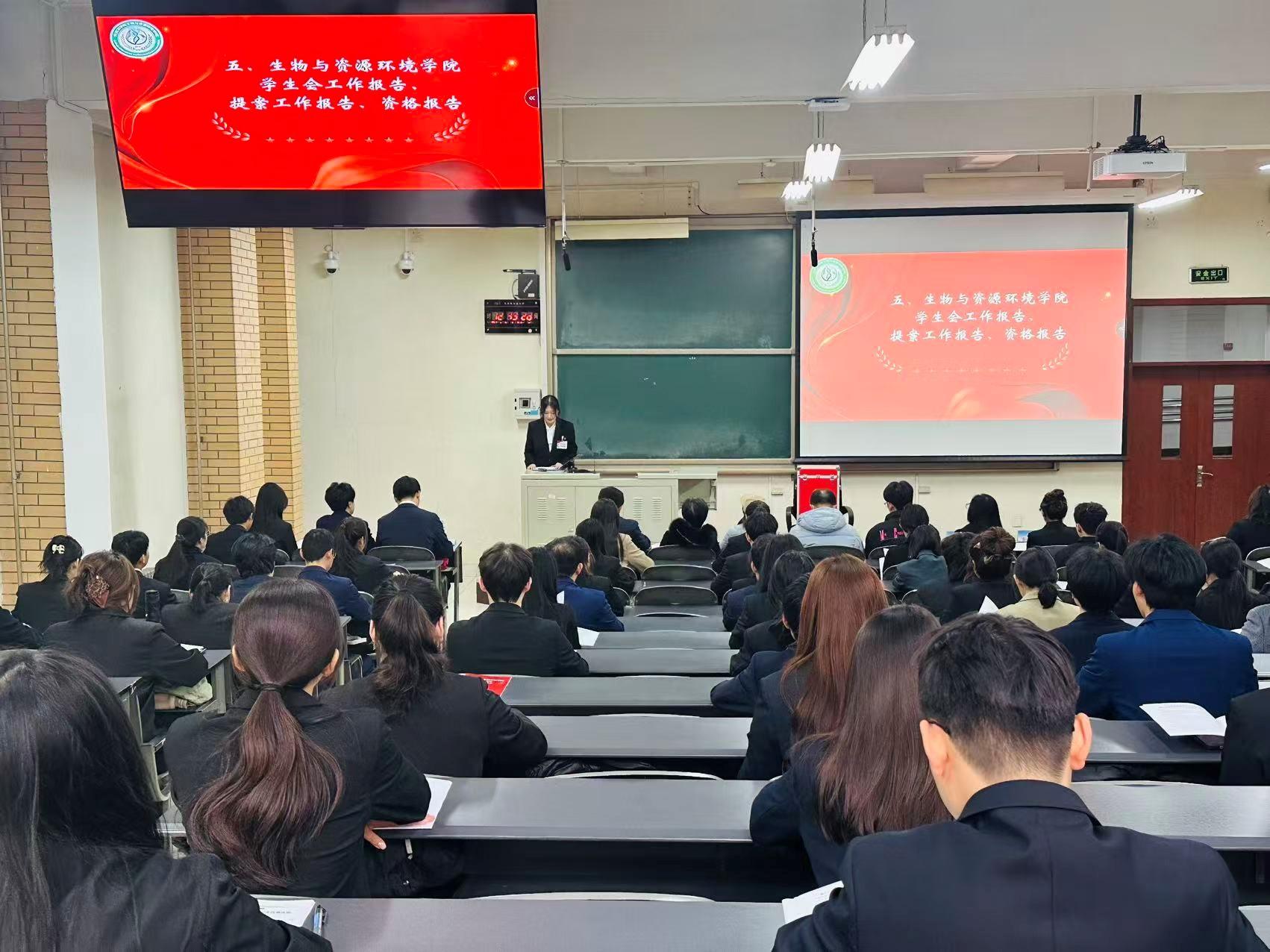 文法与城乡发展学院学生会主席作为兄弟学院代表致辞,她对本次大会的召开表示祝贺,希望两校学院学生组织能加强交流合作,共同推动学生工作迈上新台阶。生物与资源环境学院学生会负责人作工作报告与提案工作报告,全面总结了过去的工作成绩,客观分析了存在的问题,并对未来工作规划进行了详细阐述,相关报告得到了代表们的一致认可。